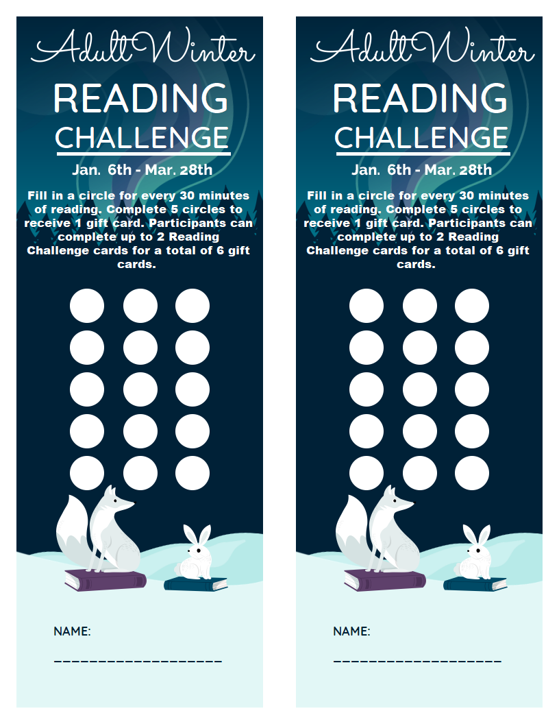 National trends show a decline in reading across all age groups. Let’s buck the trend in Custer County during the Winter Reading Challenge. The challenge starts Tuesday, January 6th at 10 a.m. and ends on Saturday, March 28th at 2 p.m. Any interested adult can pick up a reading challenge card at the library front desk or print the card using the link below. Fill in a circle for every 30 minutes of reading, including reading to others. Complete 5 circles to receive a gift card to a local business. Participants can complete up to 2 Reading Challenge Cards for a total of 6 gift cards.