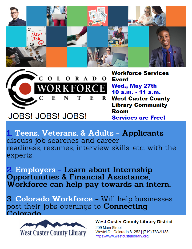 Colorado Workforce Center will be available to provide free assistance to applicants looking for a job and employers looking to hire.  Applicants speak with the experts about resumes and job interviewing skills.  Employers receive assistance posting your job openings to Connecting Colorado.  Employers can also learn about internships and how Colorado Workforce can help you pay for it.  All services are free!  Registration is recommended for this event.