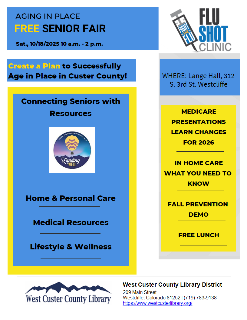 The Senior Fair is designed to support and celebrate our senior community by providing valuable information, resources, and services to create a comprehensive plan for aging in place that promotes healthy, active, and independent living. The fair will bring together local businesses, healthcare providers, non-profits, and community organizations offering products and services relevant to aging adults and their families. At the fair seniors and their families will learn how they can successfully age in place in Custer County! The fair will be held at Lange Hall at 312 S. 3rd St., Westcliffe. Public Health will be on hand at the fair to administer flu shots.