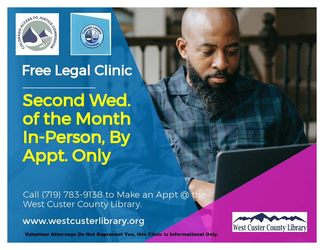 The West Custer County Library is offering a free legal clinic the second Wednesday of each month in 2025 for parties who have no attorney. Call the library staff at (719) 783-9138 to make an appointment. Volunteer attorneys will answer questions, help fill out forms, and explain the process and procedure for legal issues. The volunteer attorneys do not represent you and this clinic is informational only. Appointments are virtual and take place in the library’s privacy booth.
