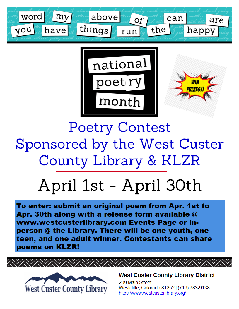 The West Custer County Library and KLZR are sponsoring a poetry contest beginning April 1st and ending April 30th. April is national Poetry Month and poets of all ages are encouraged to submit an original poem. All submitted poems will have the opportunity to be aired on KLZR. Poems can be submitted via email or in-person, each poetry submission must include a poetry contest entry form. All completed work must be submitted to the library in-person by April 30th at 5:30 p.m. or emailed to cathy@westcusterlibrary.org. Forms and event information can be found at www.westcusterlibrary.org Events Page or call the library staff at (719) 783-9138.