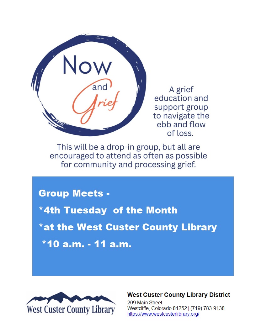 Robin Olsen of Central Colorado Area on Aging is starting a new group called Now and Grief. Grief education as well as supporting each other through sharing will be explored during the one-hour sessions on the fourth Tuesday of the month. This will be a drop-in group, but all are encouraged to attend as often as possible for community and working through the “now and then” of grief.