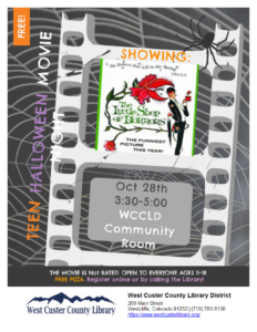 Teen Movie Night When October 28, 2023 3:30 pm - 5:00 pm Add To Calendar Download ICS Google Calendar iCalendar Office 365 Outlook Live Bookings Bookings closed Where West Custer County Library Community Room 209 Main St, Westcliffe, CO Event Type Teens (ages 11-18) Loading Map.... 209 Main St - WestcliffeEvents 38.136419 -105.467999 Bookings Bookings are closed for this event.