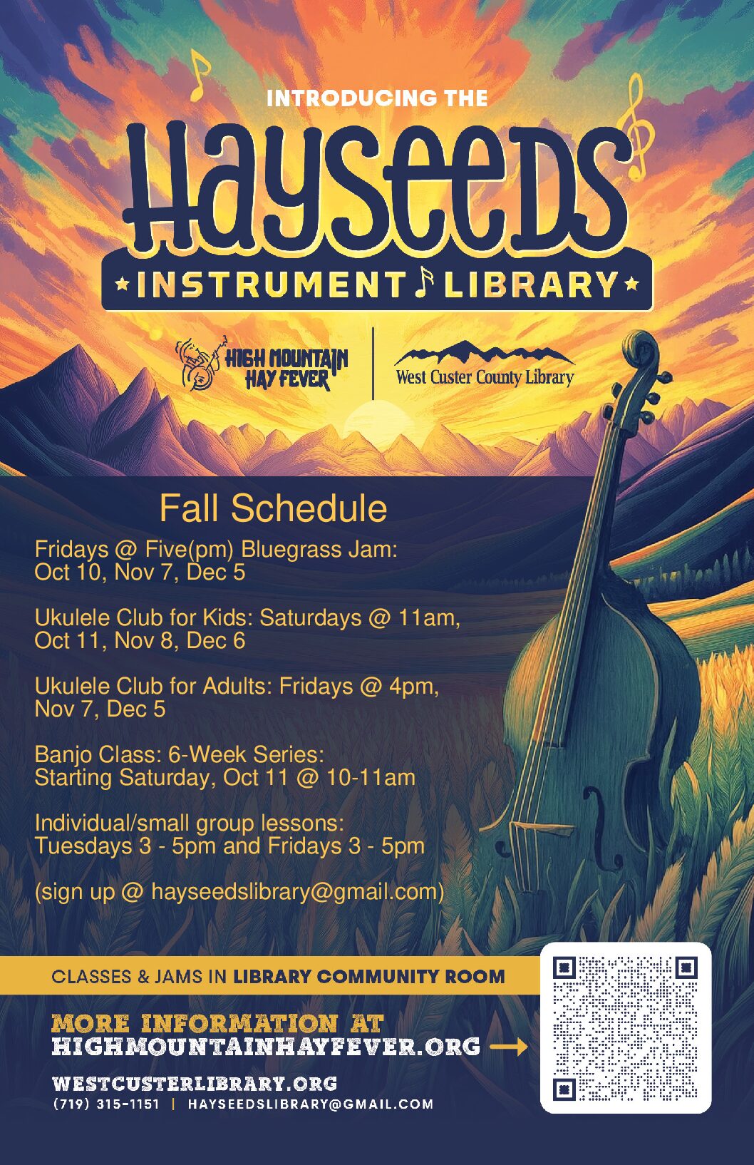 Hayseeds Instrument Library is sponsored by High Mountain Hay Fever Bluegrass Association and West Custer County Library. More information and current schedule at https://highmountainhayfever.org/hayseeds-instrument-library/